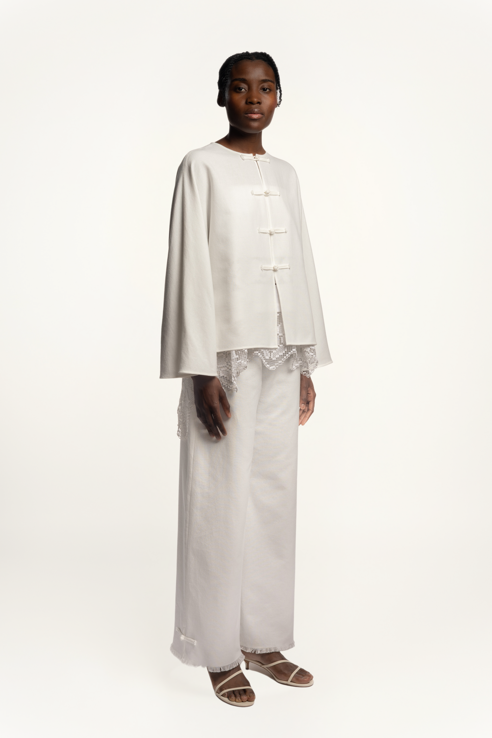 With their minimalist design, Cruise Trousers balance simplicity with subtle artisanal detailing. Soft to the touch and gently tailored, their fluid silhouette lets the wide-leg cut move with ease. Frog button appliqués enrich the hem, while raw-edged fringes offer a delicate contrast of structure and undone elegance.