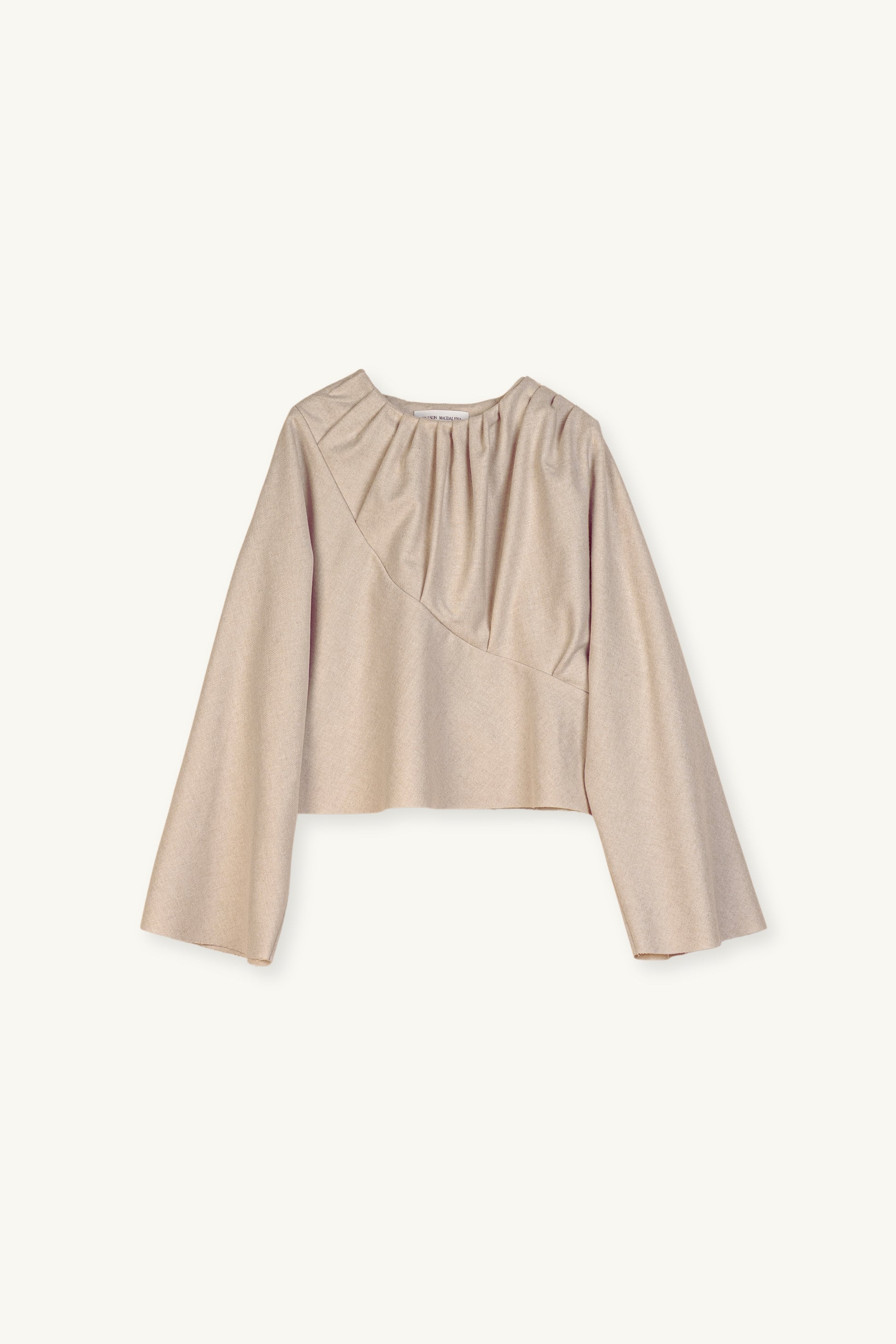 Halcyon top features an asymmetric drape around the neckline that cascades from the left side, forming graceful folds that bring movement and texture to the design. Flowing sleeves enhance the sense of fluidity, balancing the top’s sculptural lines with softness.