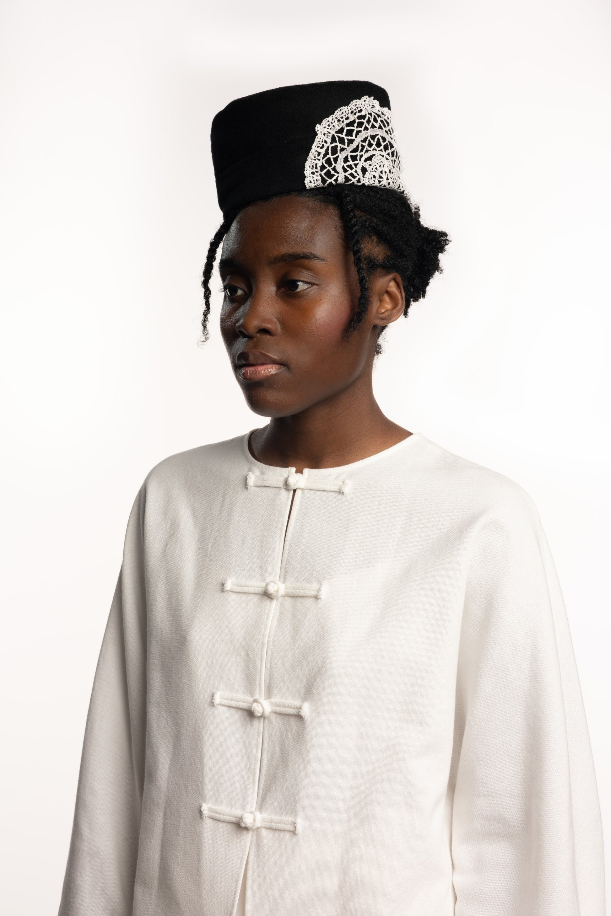 The Ornis Pillbox Hat is defined by its crocheted floral appliqué, the result of hours of meticulous handcraftsmanship. Inspired by vintage pillbox styles, Ornis pillbox hat complements both casual and formal attire.