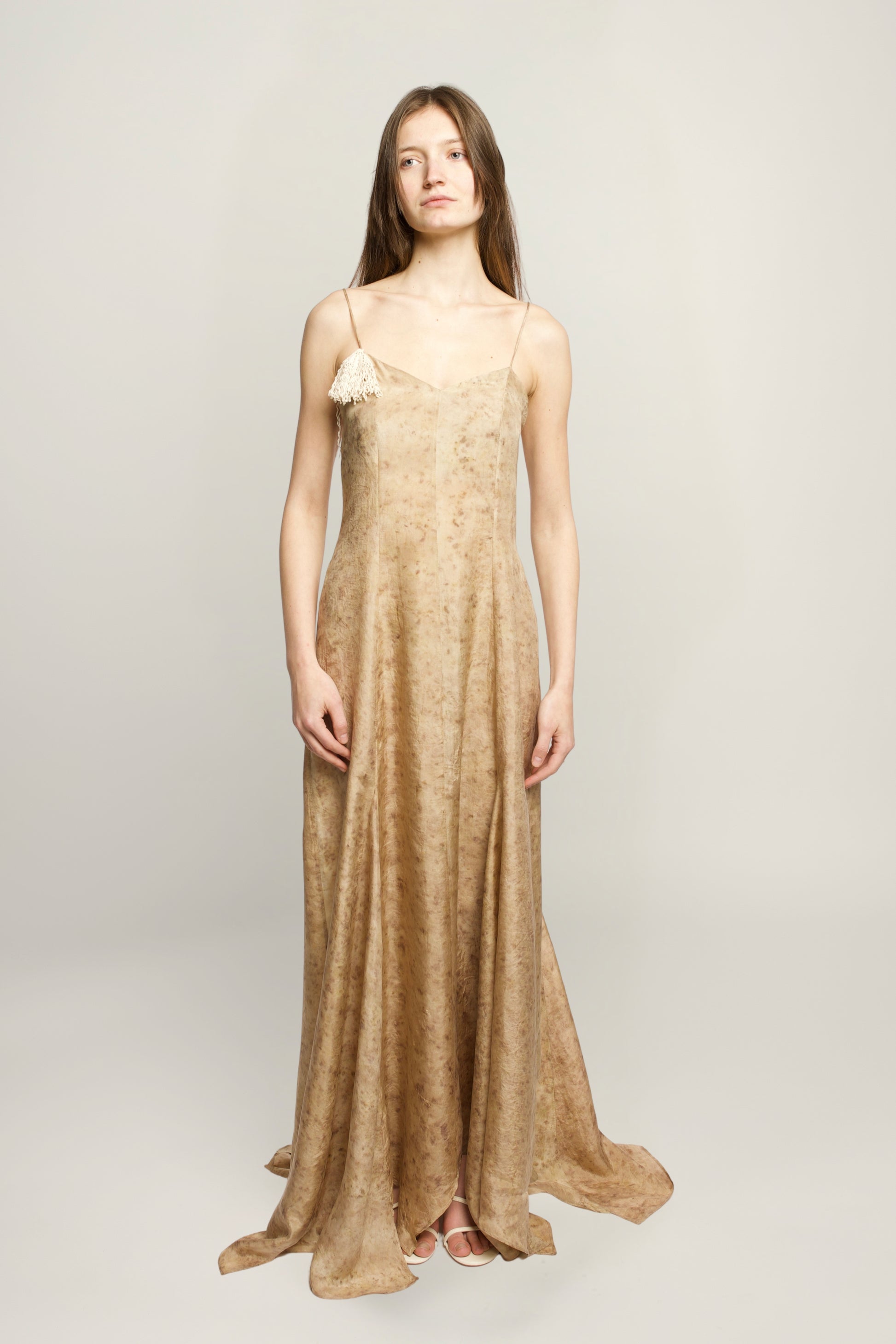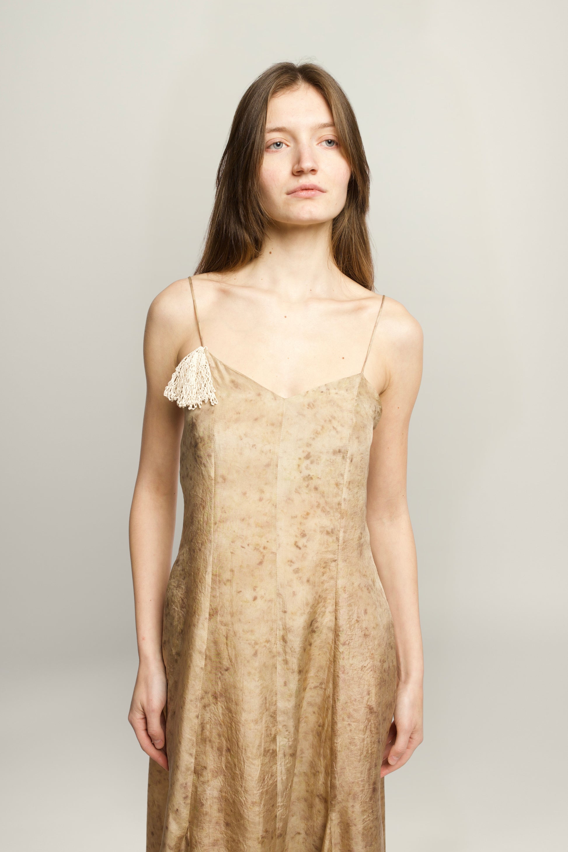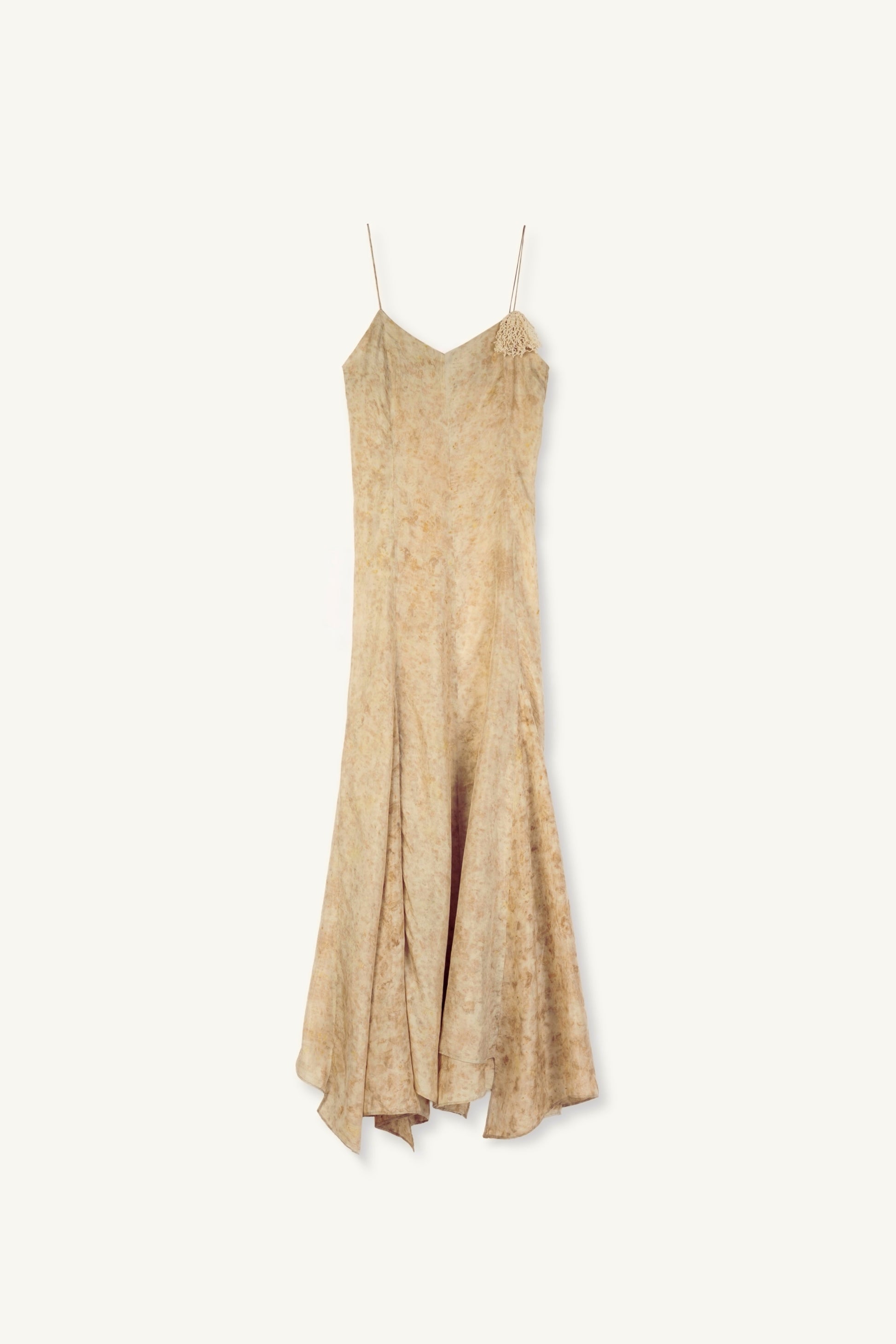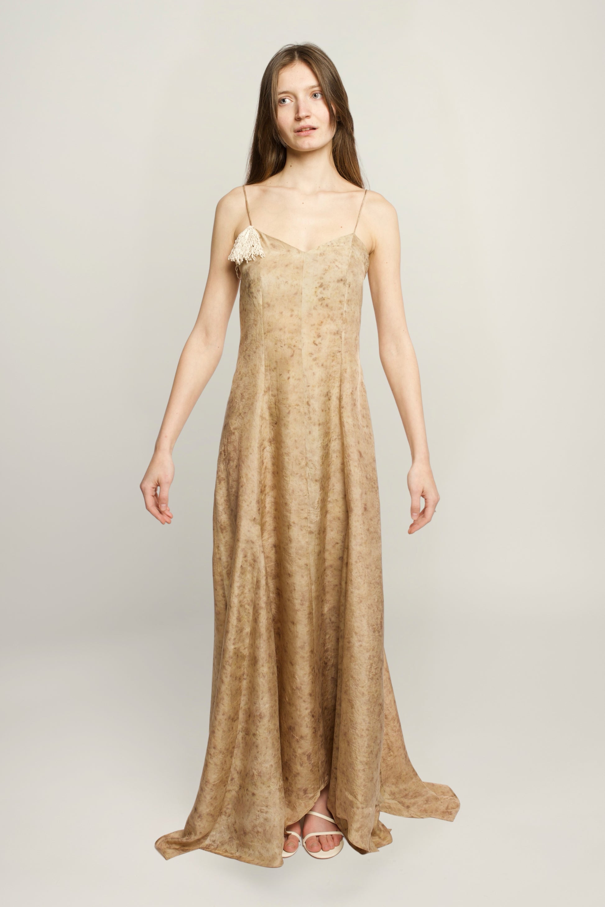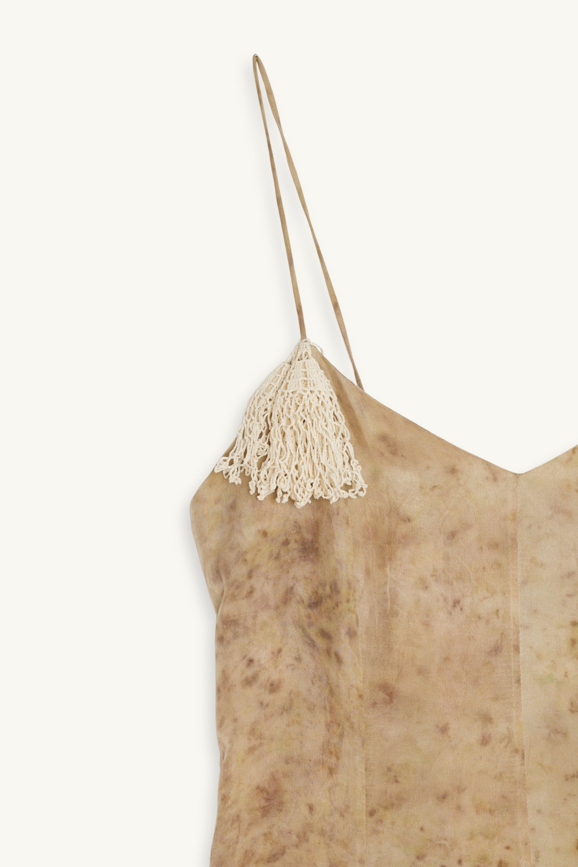 DETAILS: 100% premium silk / Botanically handmade dyed / V-neckline / Open back / Spaghetti adjustable straps / Crocheted detachable palmier brooch / Fluid silhuette / True to size / Made in Romania