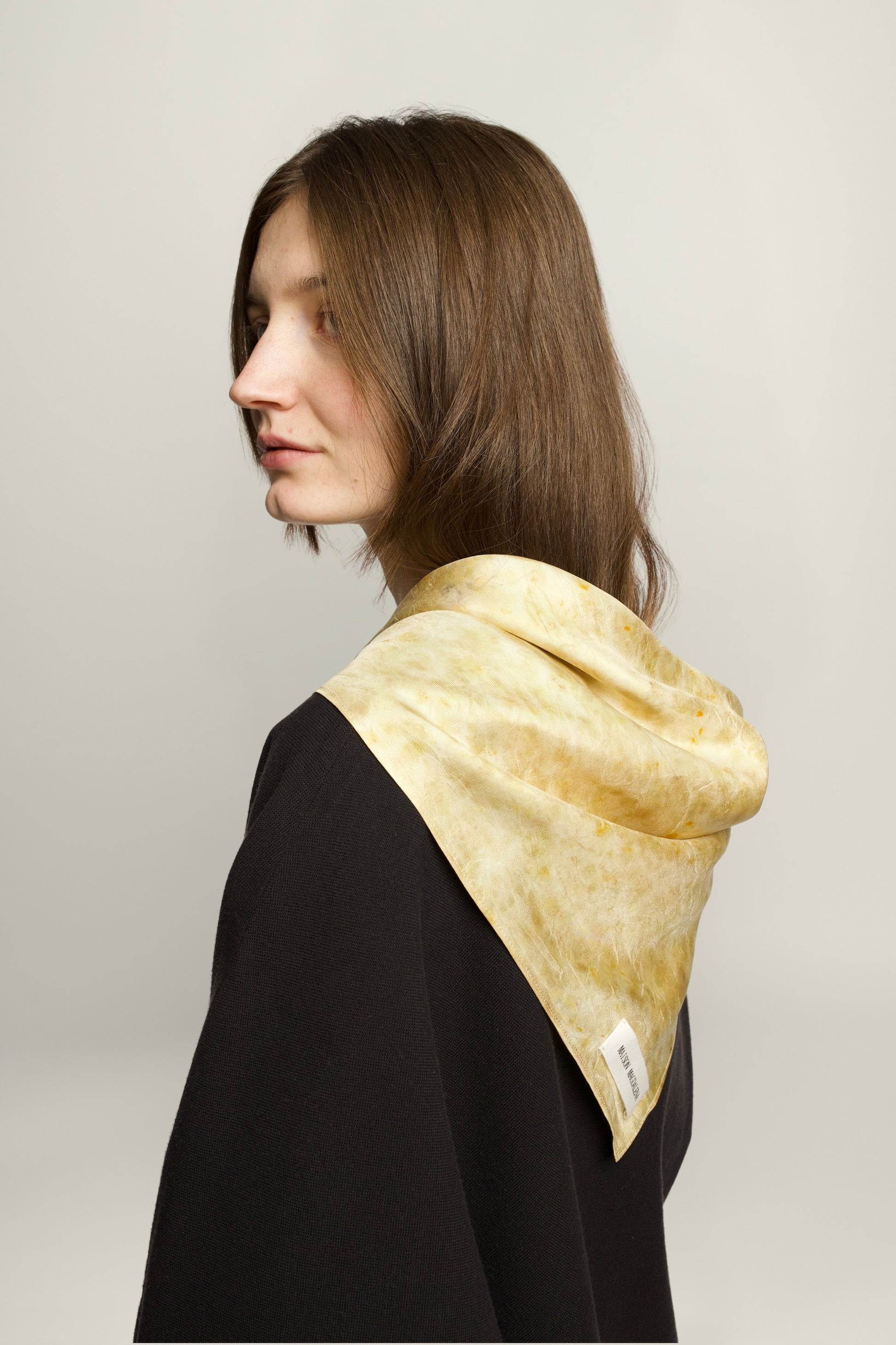 Part of our Riviera collection, this bandana embodies the harmony between nature and craftsmanship. Each piece is botanically dyed on silk to create an ethereal, one of a kind pattern. The square scarf can be styled in multiple ways, adding a warm finish to your summer looks.